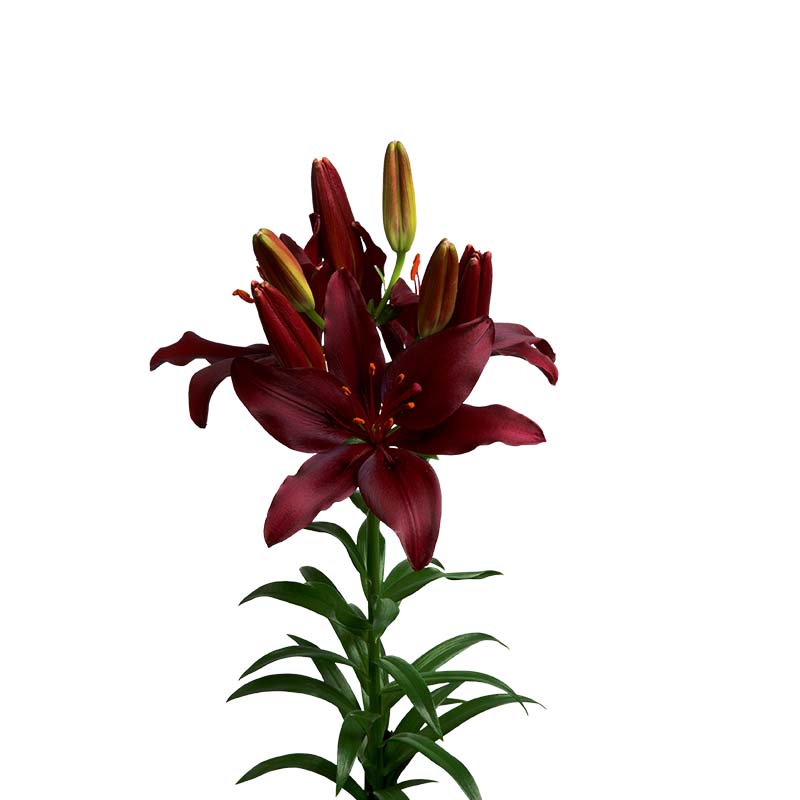 La couleur des lys a été complétée par d'autres fleurs, telles que des roses cappuccino, des œillets et des chrysanthèmes à grandes fleurs. L'ensemble constitue une base idéale pour mettre en valeur la beauté du Dark Secret. L'ensemble a été complété par des herbes séchées de Miscanthus Sinensis Zebrinus.